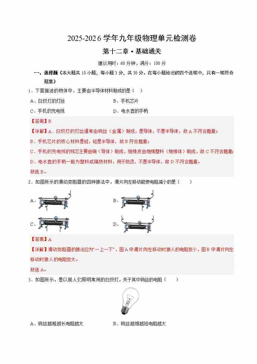 首页 > 全部 > 单元测试 > 第十二章 欧姆定律(单元测试·基础卷)(教师版)