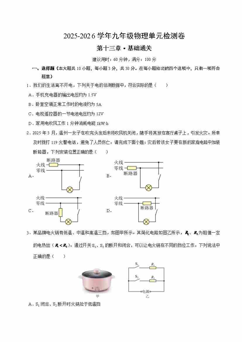 第十三章 电能与电功率(单元测试·基础卷)(考试版A4)