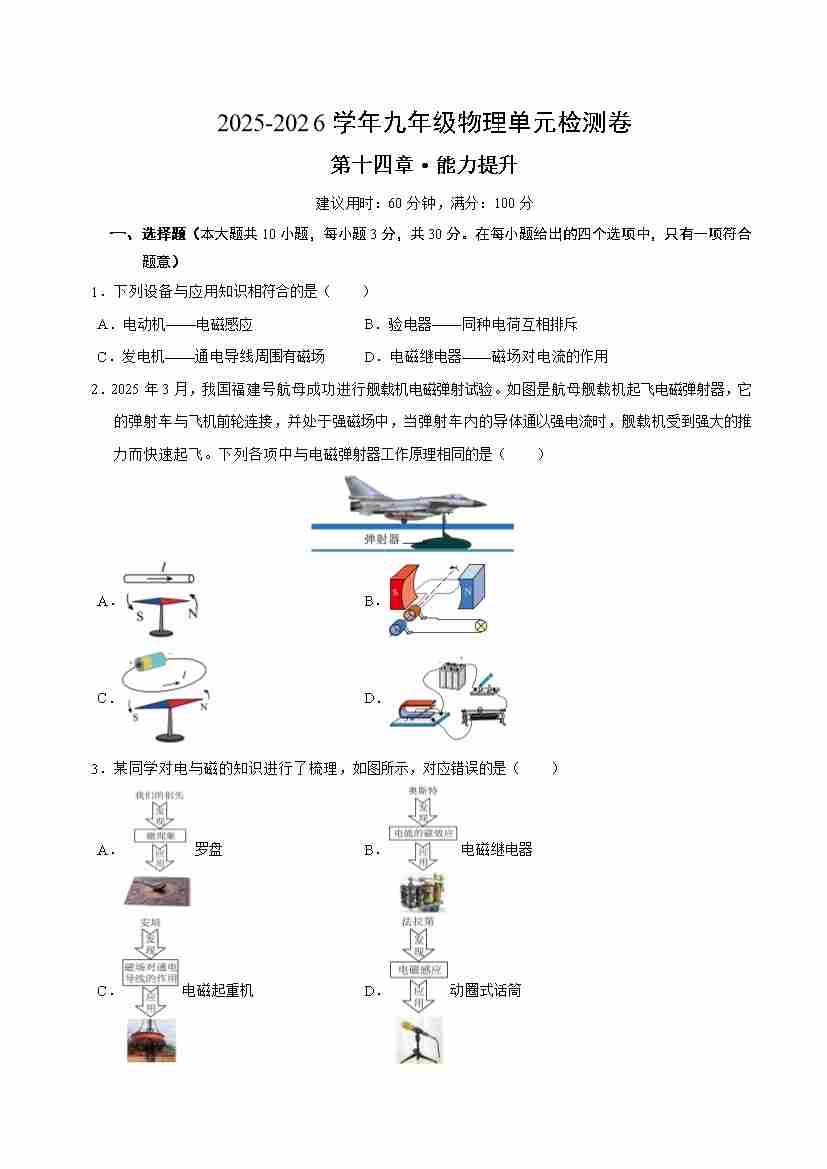 首页 > 全部 > 单元测试 > 第十四章 电与磁(单元测试·提升卷)(考试版A4)