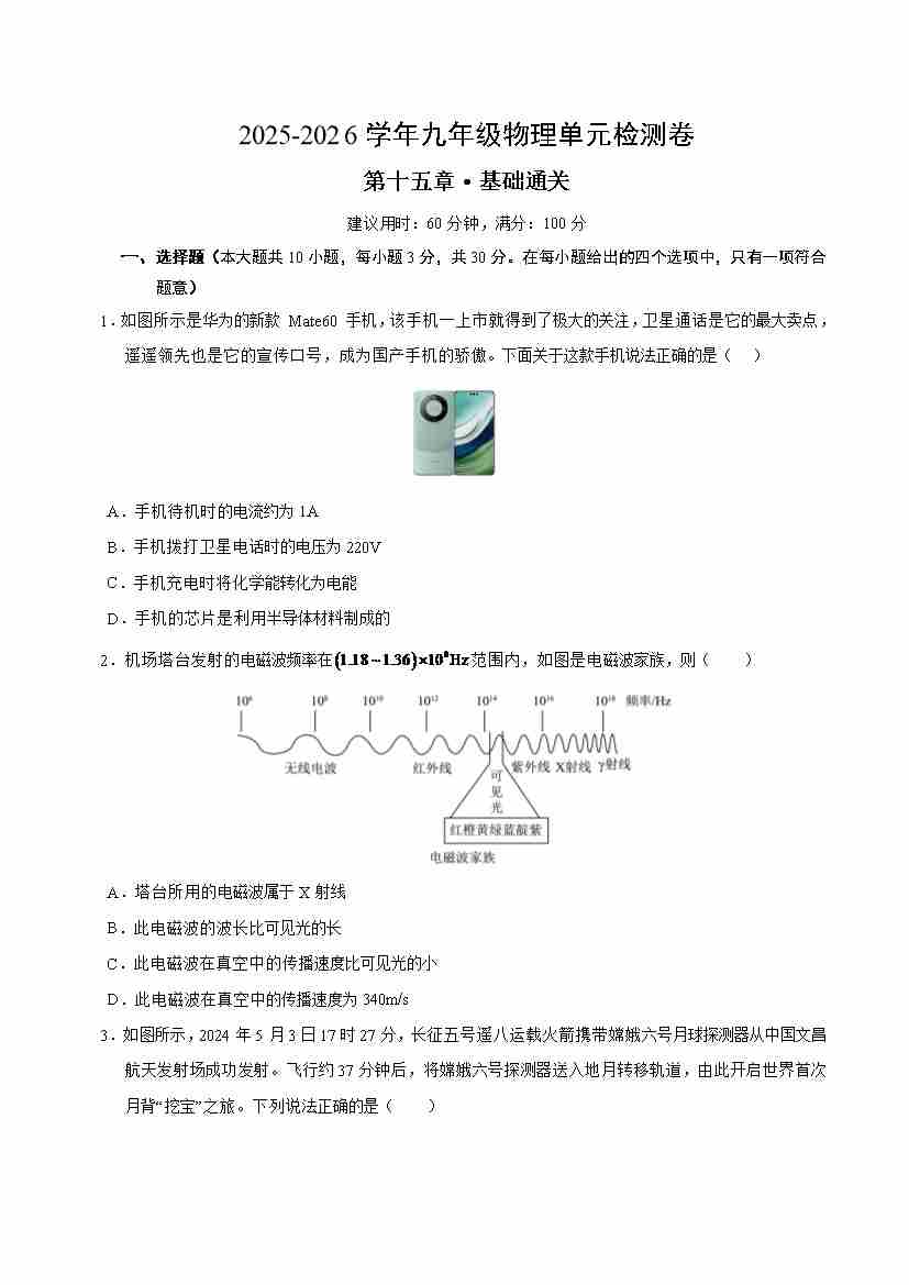 第十五章 电磁波与通信技术(单元测试·基础卷)(考试版A4)