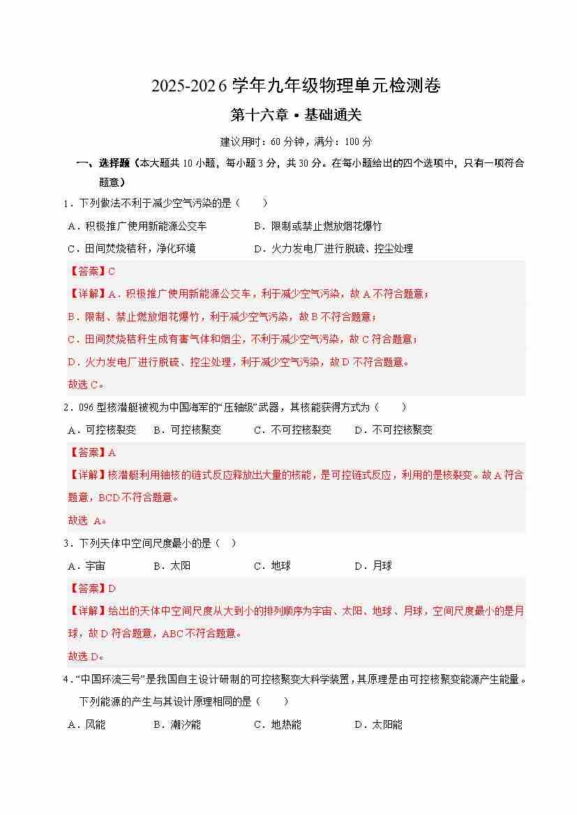 第十六章 永恒的探索:宇宙和粒子(单元测试·基础卷)(解析版)