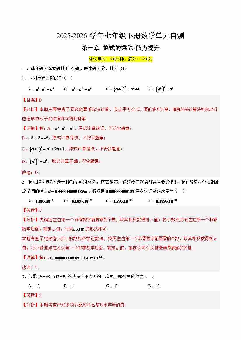 首页 > 全部 > 单元试卷 > 七下数学第一章 整式的乘除·提升卷(解析版)