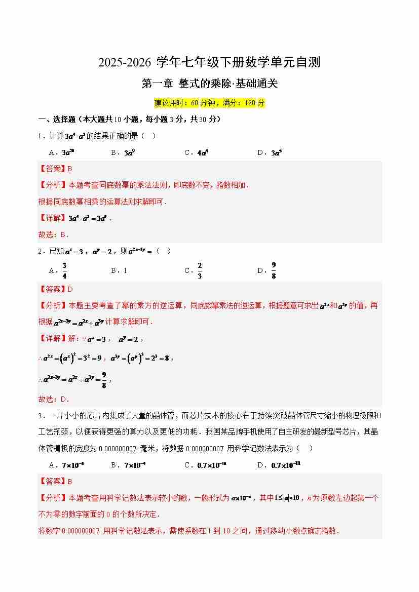 首页 > 全部 > 单元试卷 > 七下数学第一章 整式的乘除·基础卷(解析版)