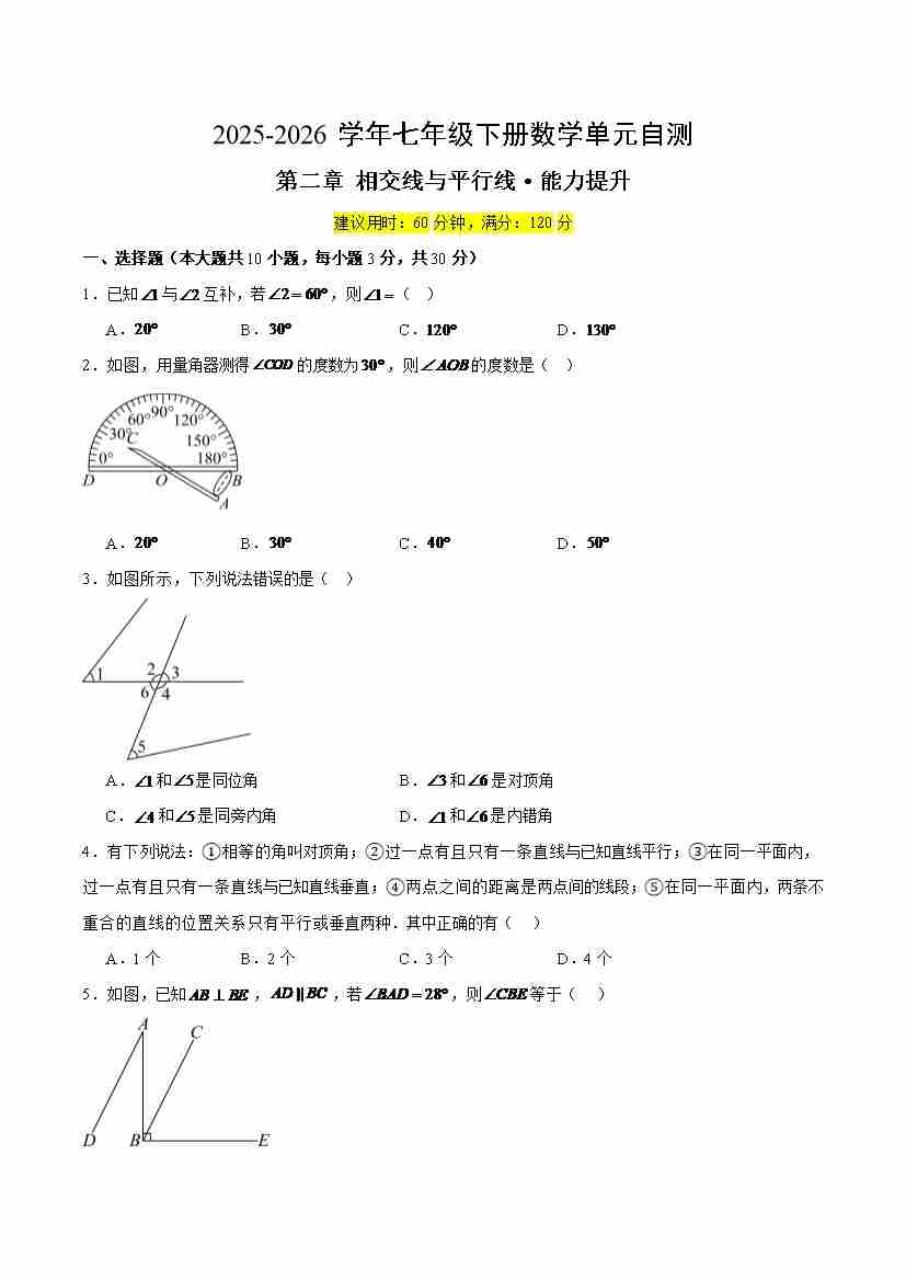 首页 > 全部 > 单元试卷 > 七下数学第二章 相交线与平行线·提升卷(试题版A4)