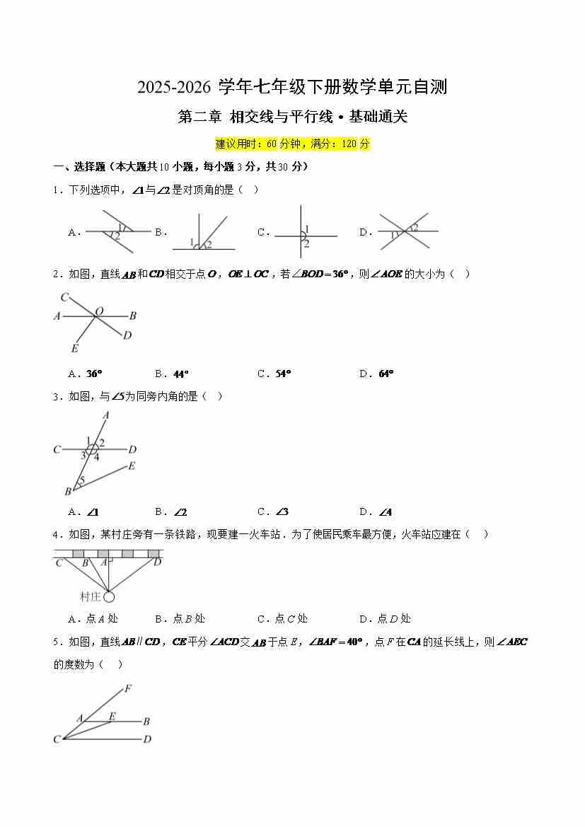 七下数学第二章 相交线与平行线·基础卷(试题版A4)