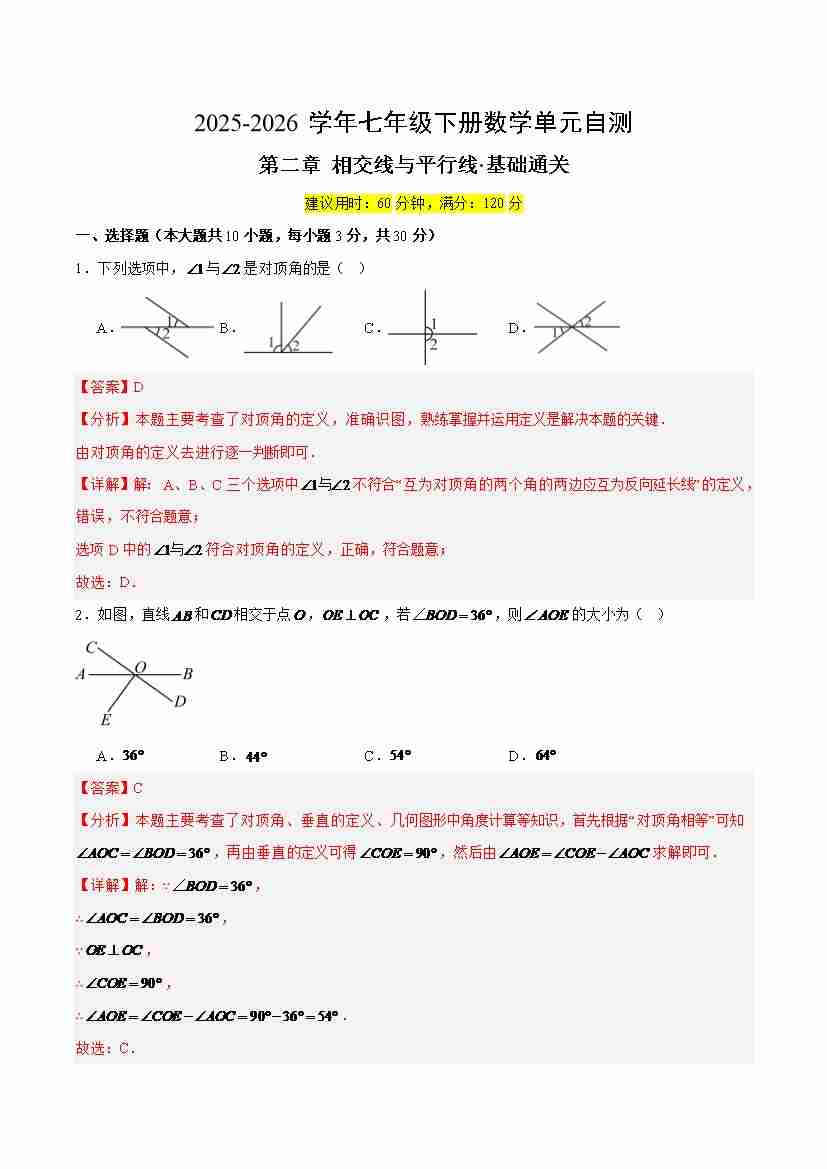 首页 > 全部 > 单元试卷 > 七下数学第二章 相交线与平行线·基础卷(解析版)