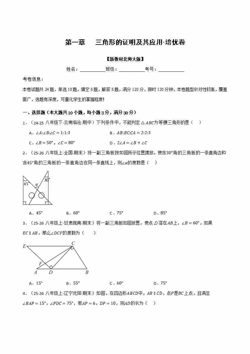 第一章 三角形的证明及其应用(举一反三单元自测·培优卷)(试题版)
