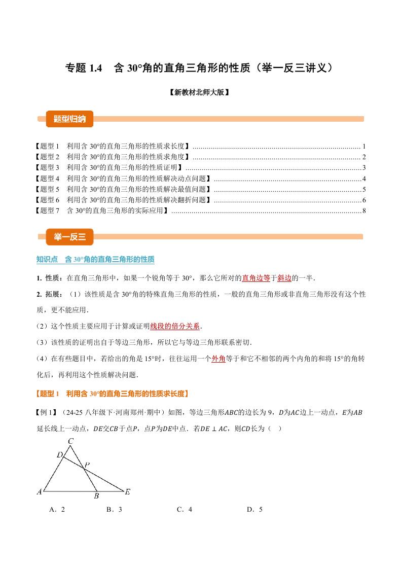 首页 > 全部 > 举一反三 > 专题1.4 含30°角的直角三角形的性质(举一反三讲义)(试题版)