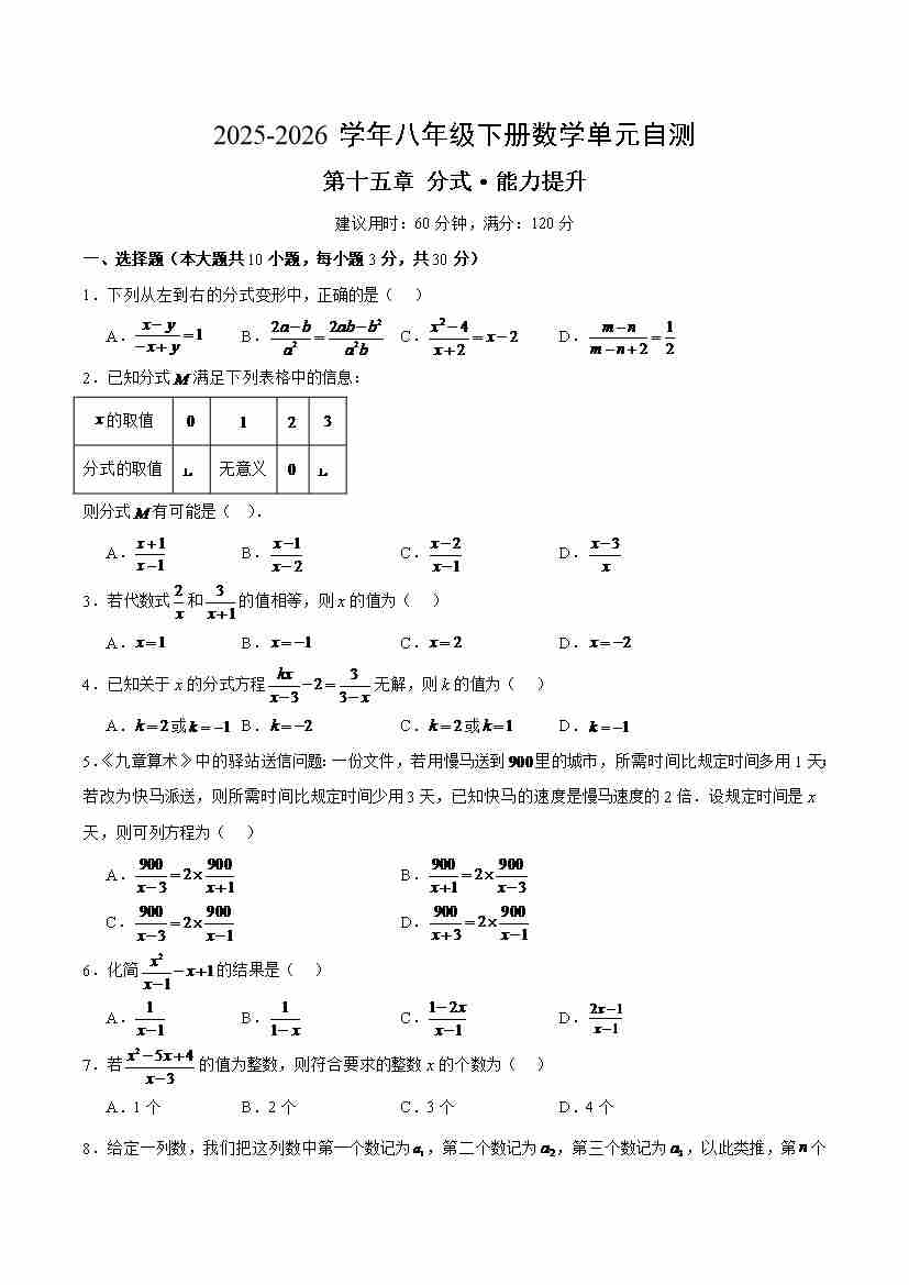 八下数学第十五章 分式·提升卷(试题版A4)