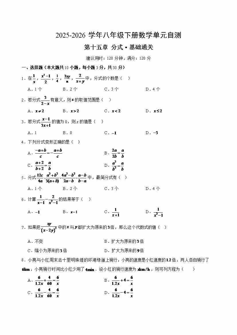 首页 > 全部 > 单元测试 > 八下数学第十五章 分式·基础卷(试题版A4)