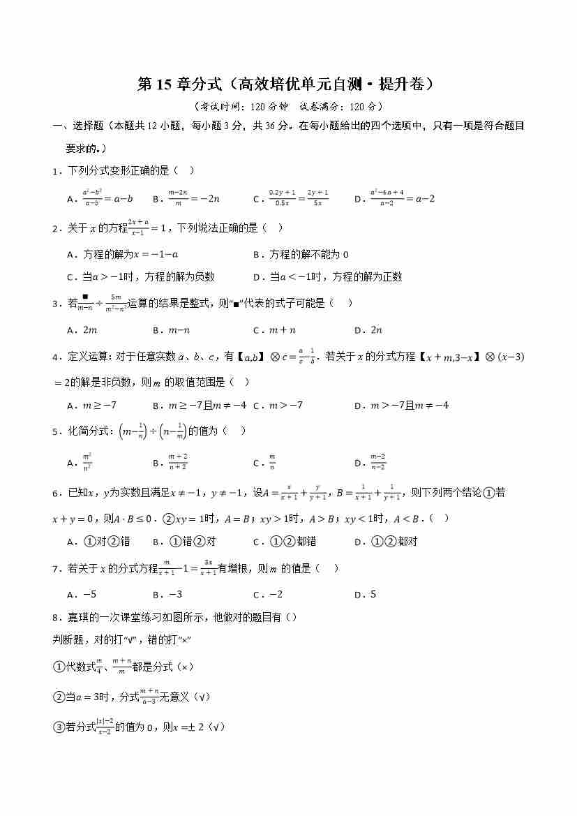 首页 > 全部 > 同步讲义 > 第15章分式(高效培优单元自测·提升卷)(原卷版)