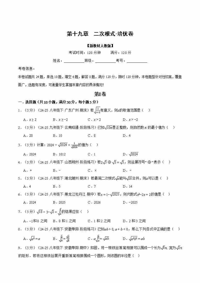 首页 > 全部 > 举一反三 > 第十九章 二次根式(举一反三单元自测·培优卷)(试题版)