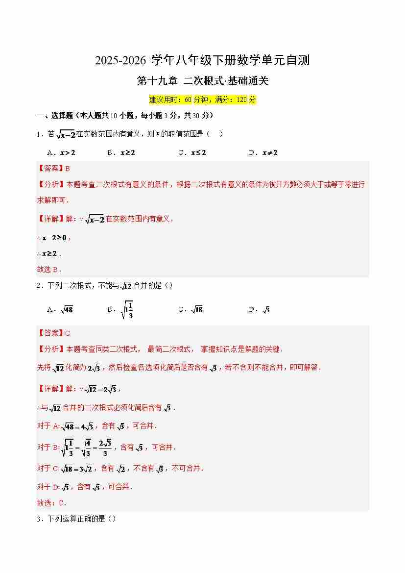 首页 > 全部 > 单元检测 > 八下数学第十九章 二次根式·基础卷(解析版)
