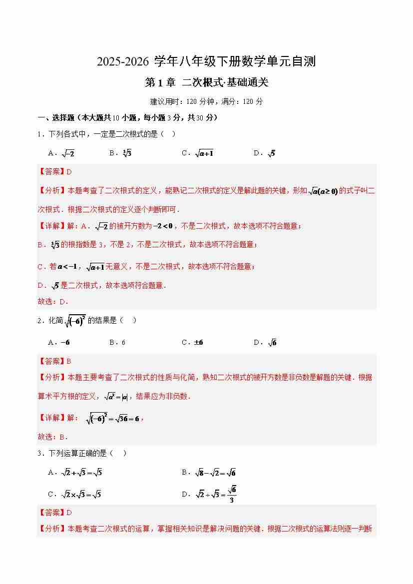 首页 > 全部 > 单元测试 > 八下数学第1章 二次根式·基础卷(解析版)