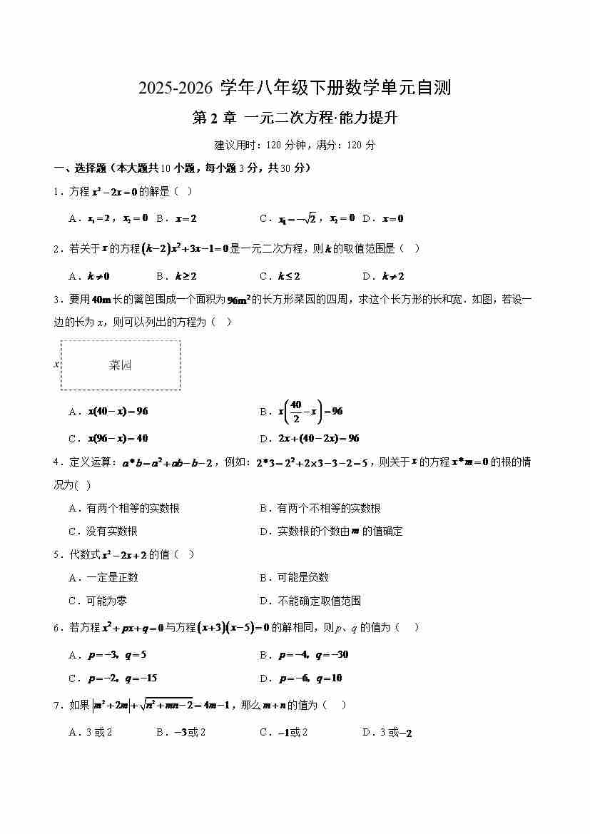 八下数学第2章 一元二次方程·提升卷(试题版A4)
