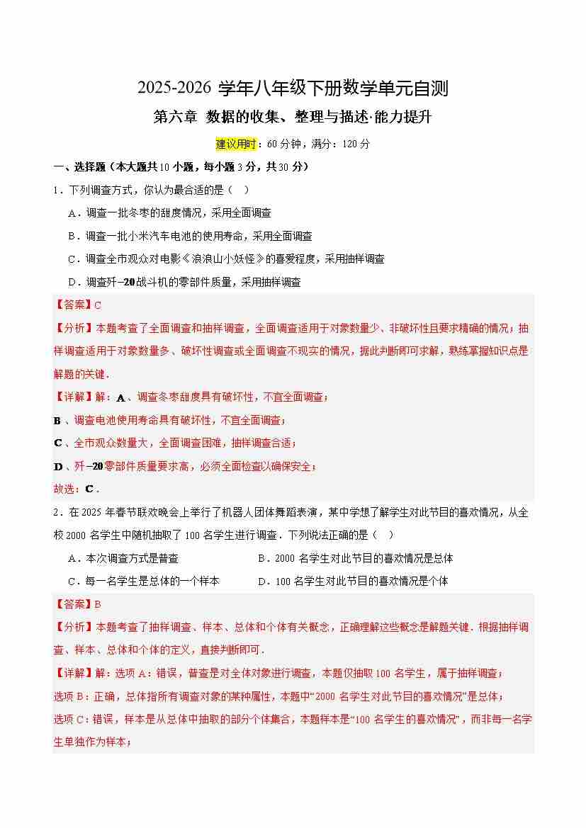 八下数学第六章 数据的收集、整理与描述·提升卷(解析版)