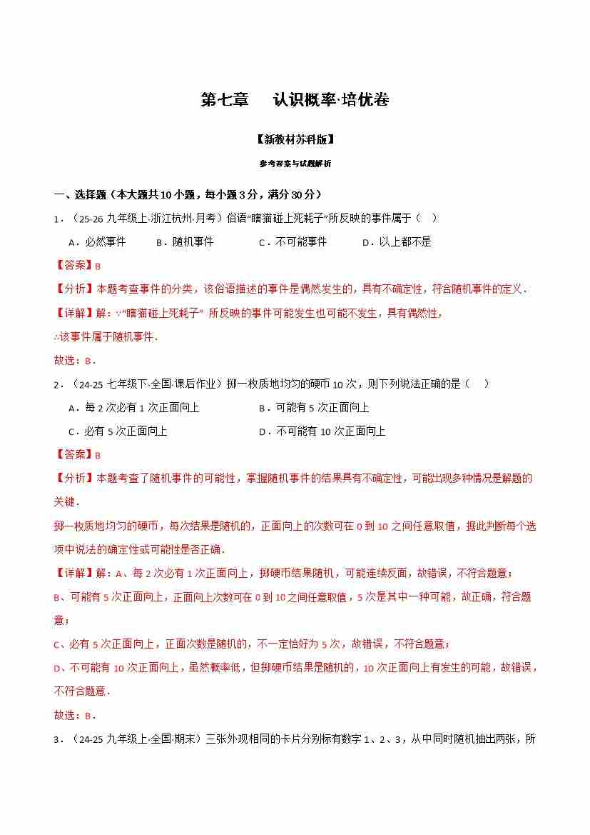 首页 > 全部 > 举义反三 > 第七章 认识概率(举一反三单元自测·培优卷)(解析版)