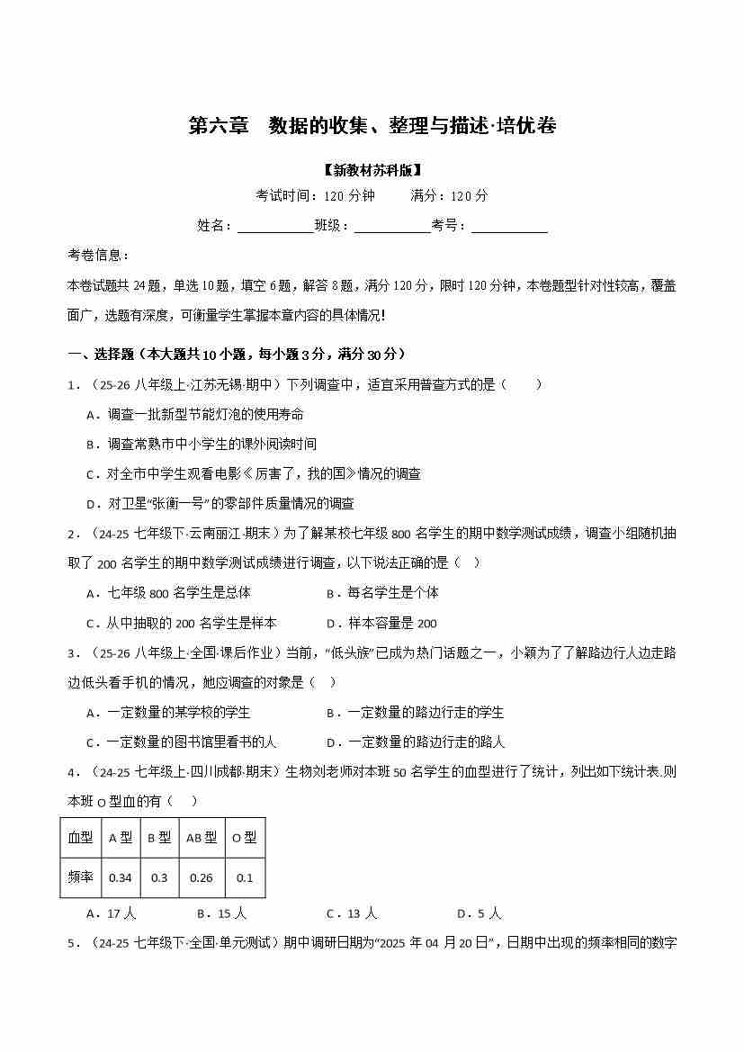 第六章 数据的收集、整理与描述(举一反三单元自测·培优卷)(试题版)
