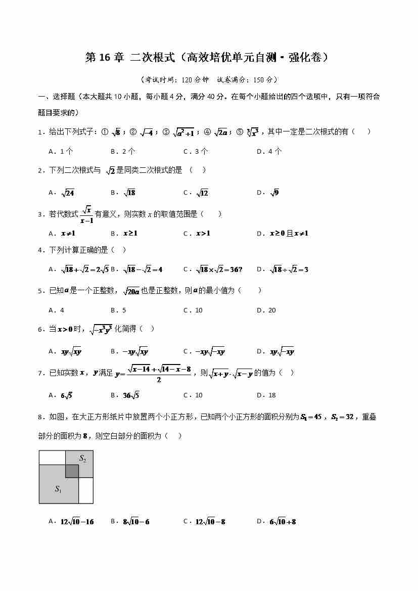 第16章 二次根式(高效培优单元自测·强化卷)(原卷版)