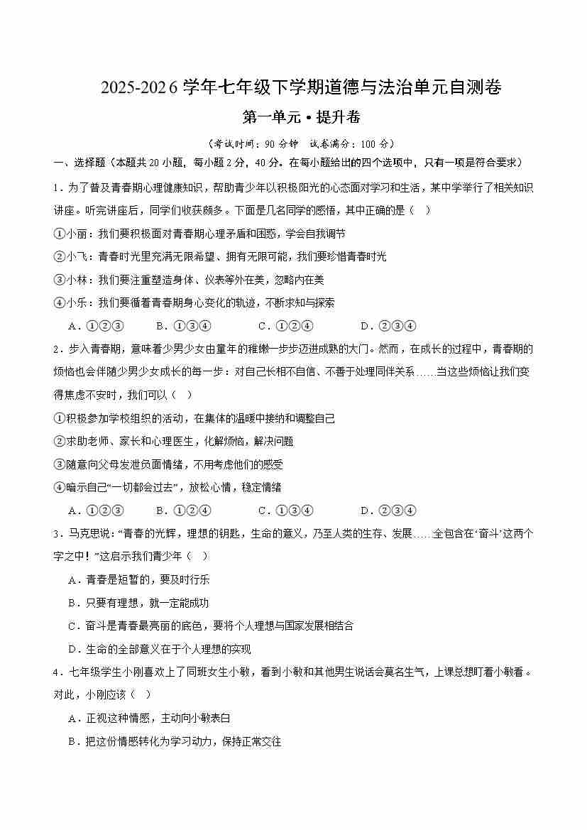 第一单元 珍惜青春时光(单元自测·提升卷)(试题版A4)