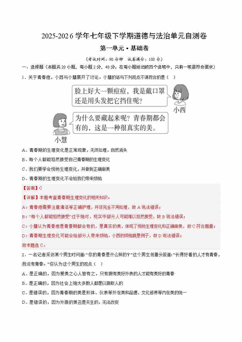 第一单元 珍惜青春时光(单元自测·基础卷)(解析版)