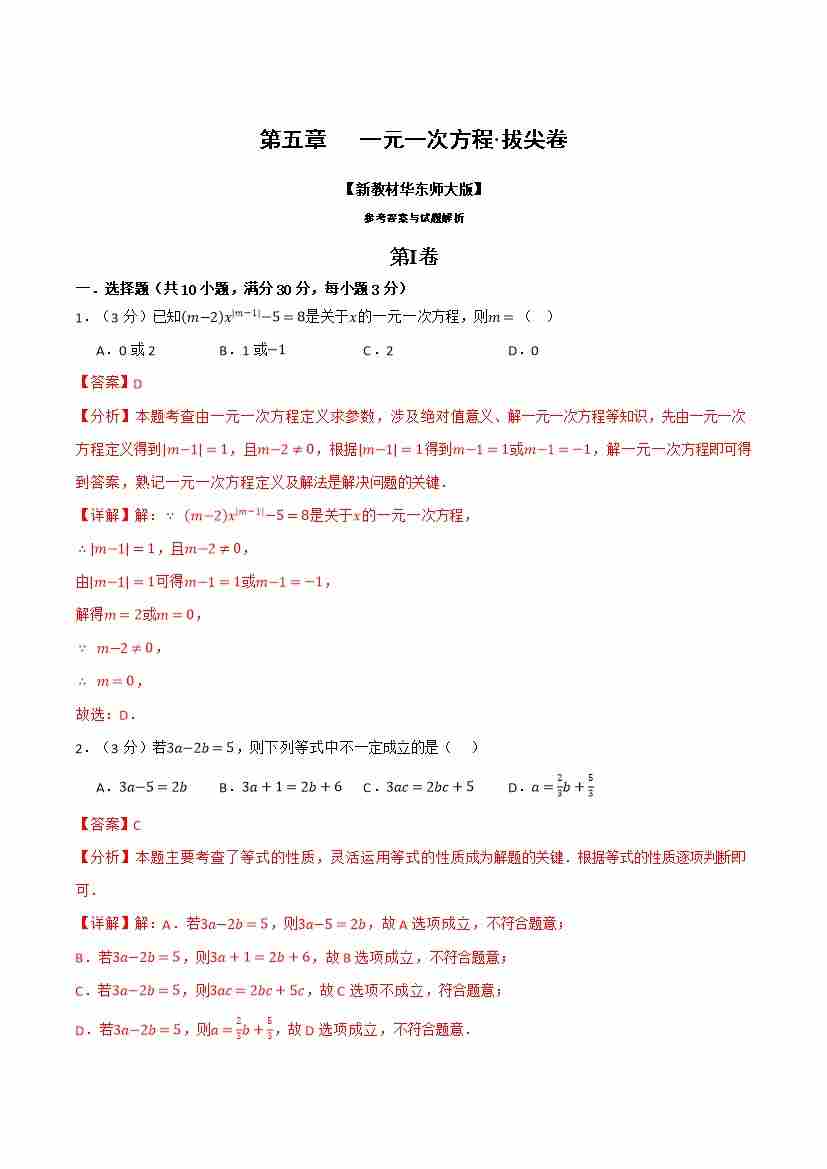首页 > 全部 > 举一反三 > 第五章 一元一次方程(举一反三单元自测·拔尖卷)(解析版)