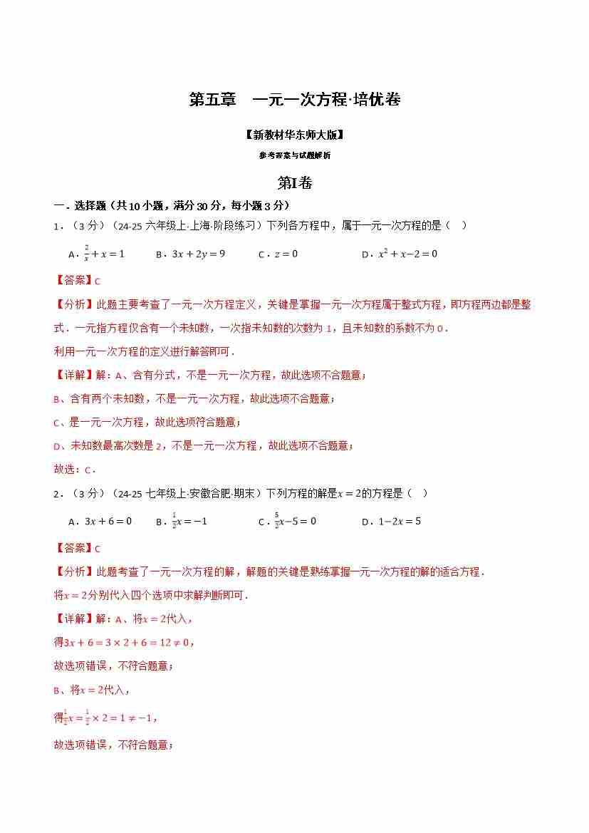 首页 > 全部 > 举一反三 > 第五章 一元一次方程(举一反三单元自测·培优卷)(解析版)