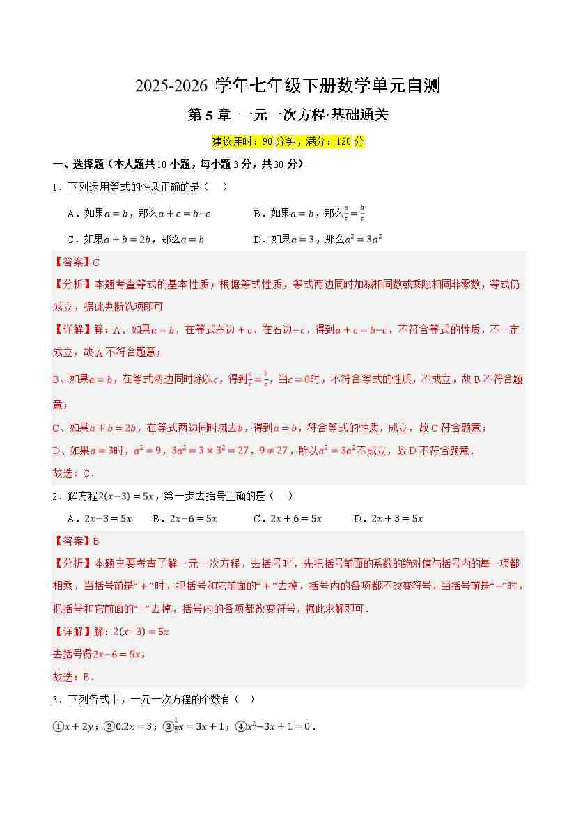 首页 > 全部 > 单元试卷 > 七下数学第5章 一元一次方程·基础卷(解析版)