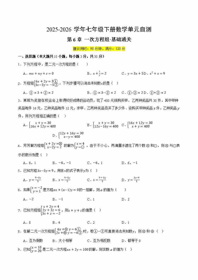 首页 > 全部 > 单元试卷 > 七下数学第6章 一次方程组·基础卷(试题版A4)