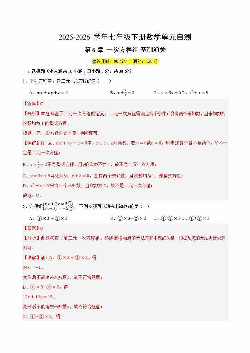 首页 > 全部 > 单元试卷 > 七下数学第6章 一次方程组·基础卷(解析版)