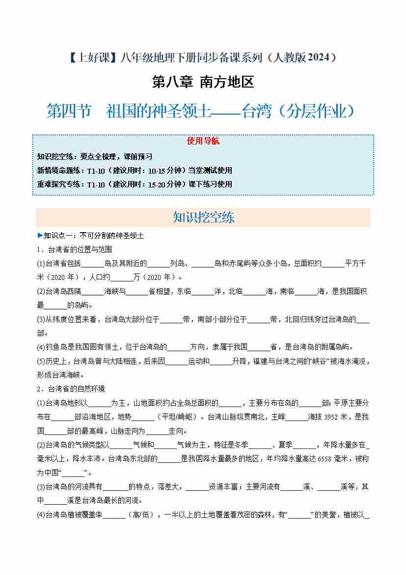 首页 > 全部 > 分层作业 > 8.4 祖国的神圣领土——台湾(分层作业)(原卷版)