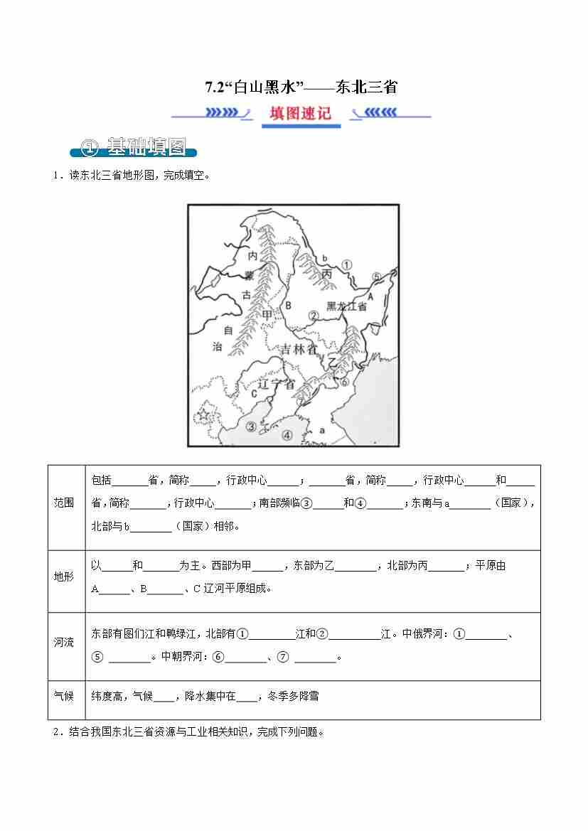 7.2“白山黑水”——东北三省(填图速记)原卷版