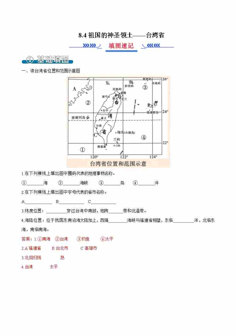 首页 > 全部 > 填图练习 > 8.4祖国的神圣领土——台湾省(填图速记)解析版