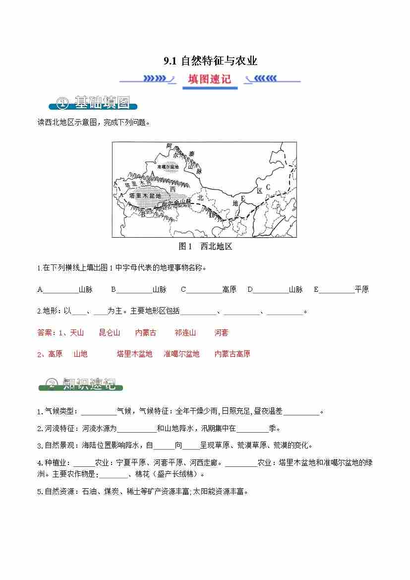 9.1西北地区——自然特征与农业(填图速)解析版