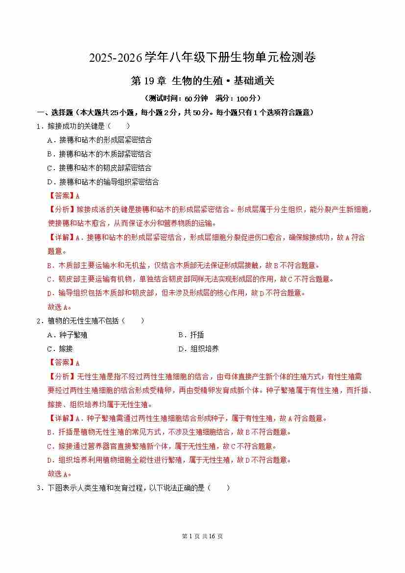 首页 > 全部 > 单元基础卷 > 第19章 生物的生殖(单元测试·基础卷)(解析版)