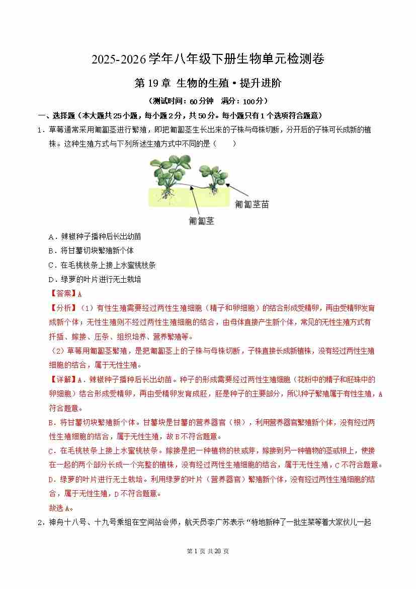 首页 > 全部 > 单元提升卷 > 第19章 生物的生殖(单元测试·提升卷)(解析版)
