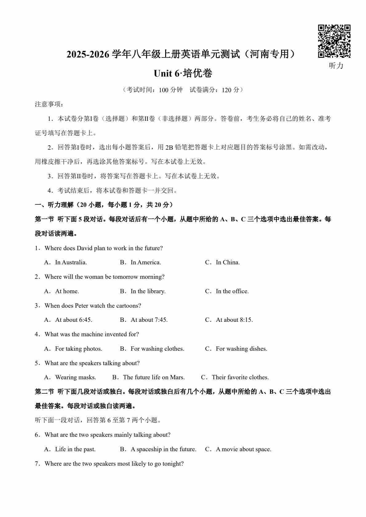 首页 > 全部 > 单元提升卷 > 八年级英语上册Unit 6 单元测试·河南专用(考试版A4)PDF带听力