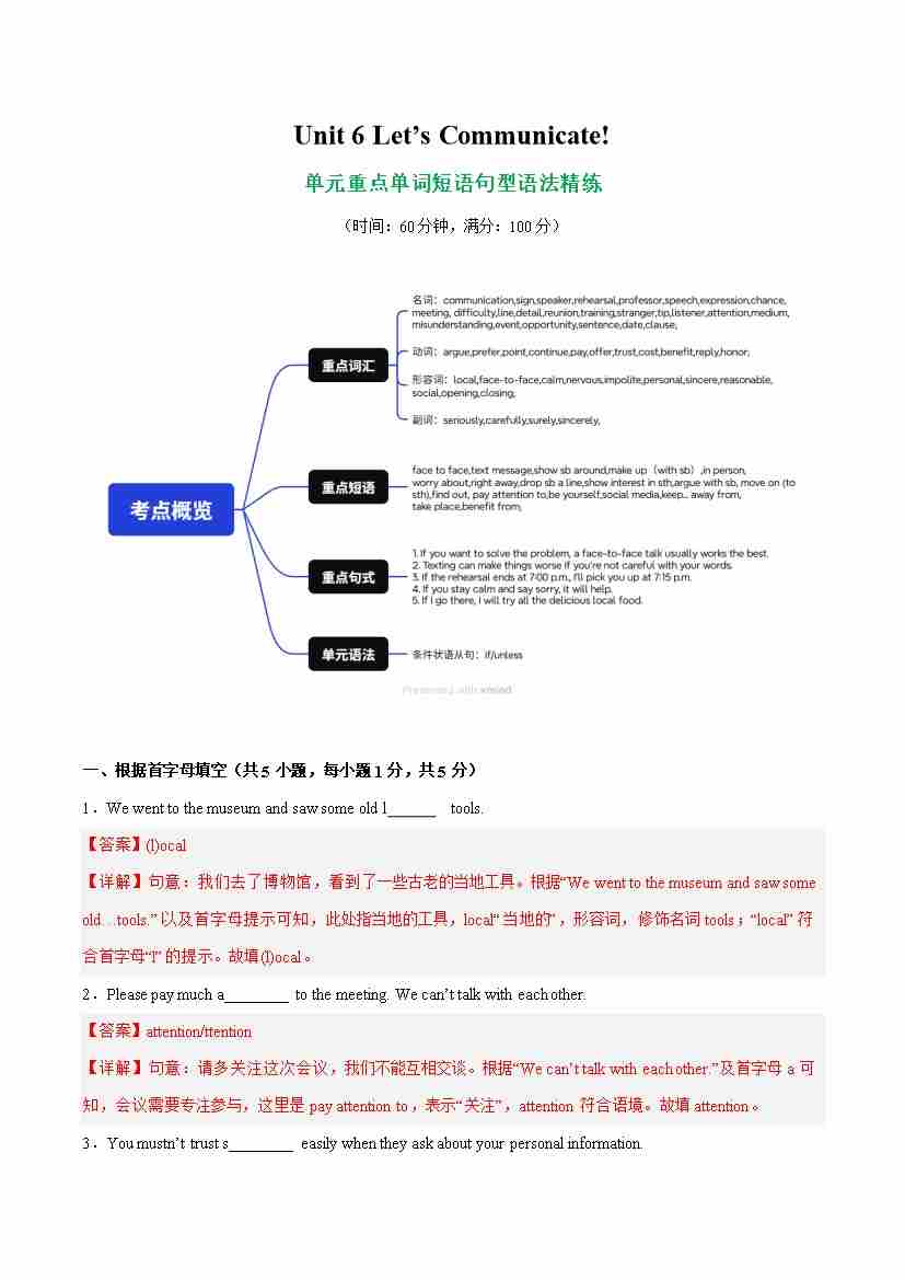 首页 > 全部 > 考点精练 > Unit 6 Let's communicate! 单词短语句型语法(教材考点精练)(解析版)