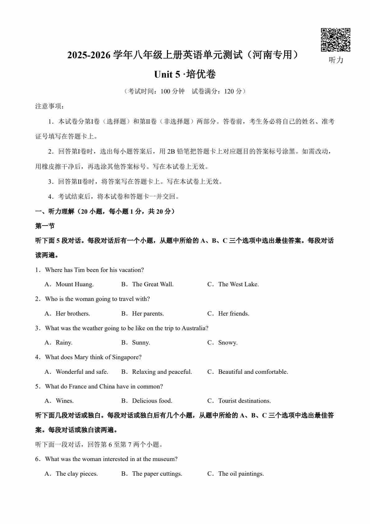 八年级英语上册Unit 5 单元测试·河南专用(考试版A4)PDF带听力