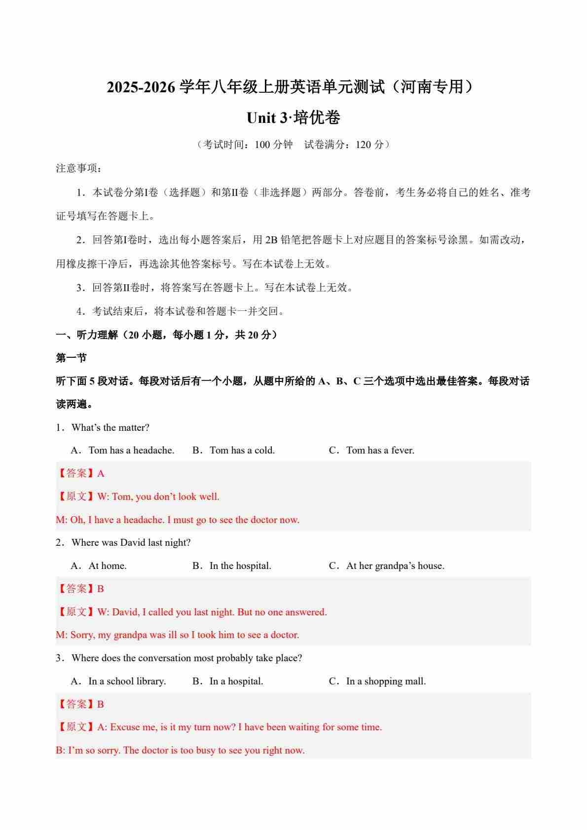 首页 > 全部 > 单元提升卷 > 八年级英语上册Unit 3 单元测试·河南省卷专用(解析版)