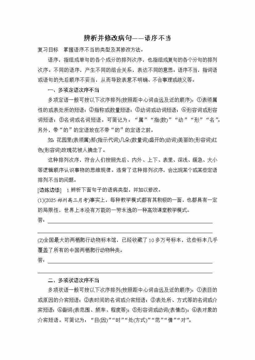 高三语文一轮复习语言文字运用学案:辨析并修改病句——语序不当
