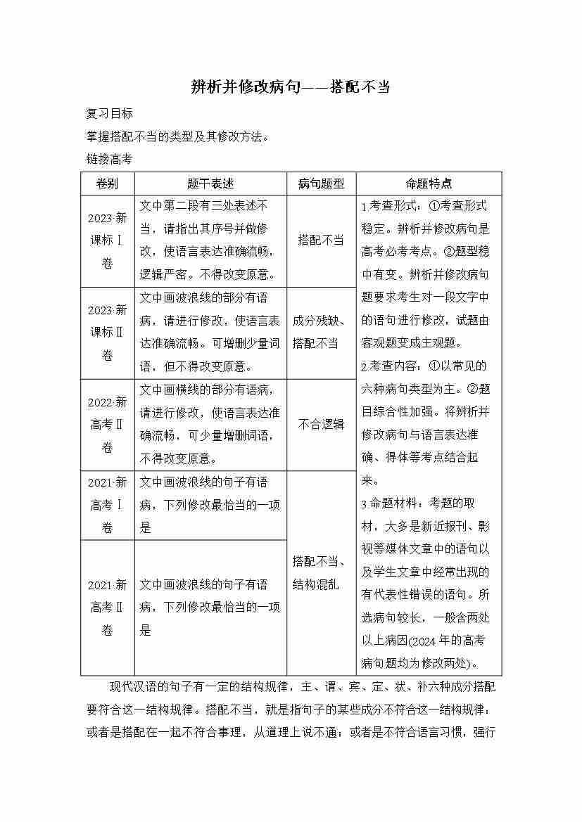 高三语文一轮复习语言文字运用学案:辨析并修改病句——搭配不当