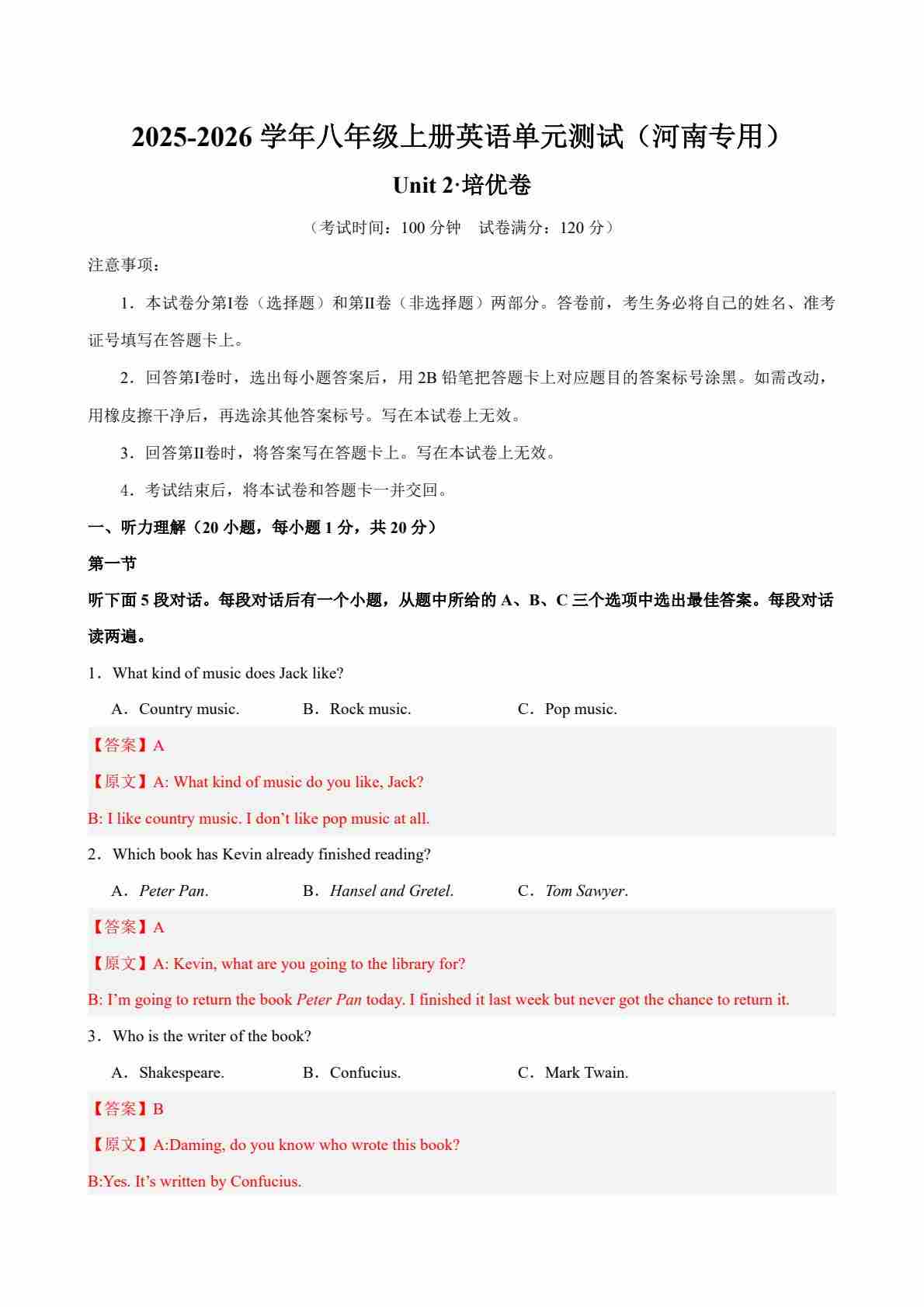 首页 > 全部 > 单元提升卷 > 八年级英语上册Unit 2 单元测试·河南专用(解析版)
