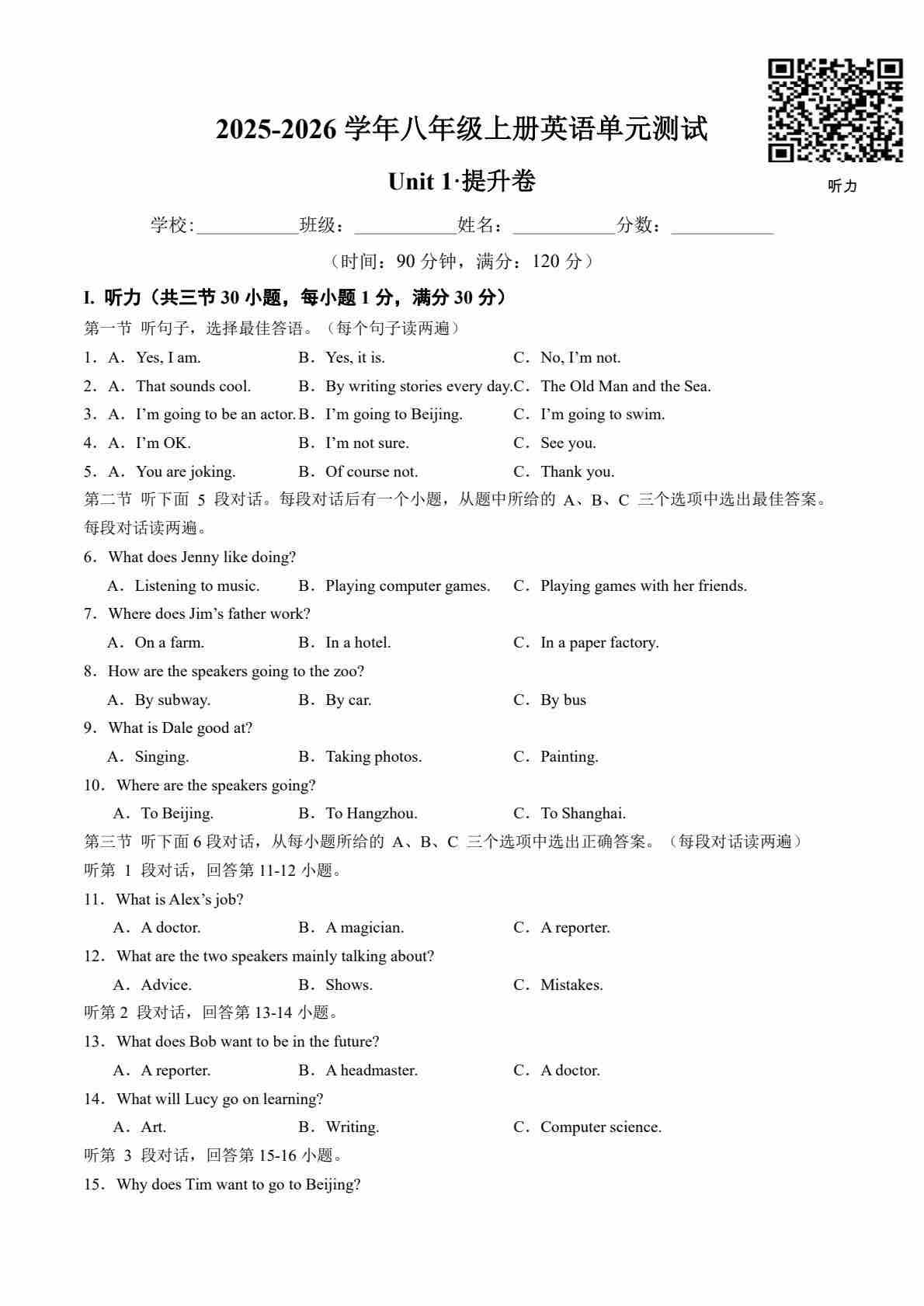 首页 > 全部 > 单元提升卷 > 八年级英语上册Unit 1 单元测试·提升卷(考试版A4)PDF带听力
