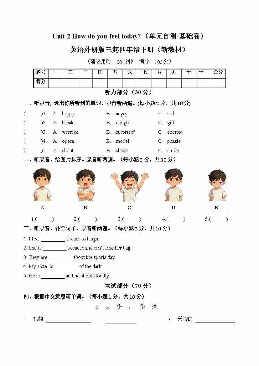 Unit 2 How do you feel today?(单元自测·基础卷)A4版