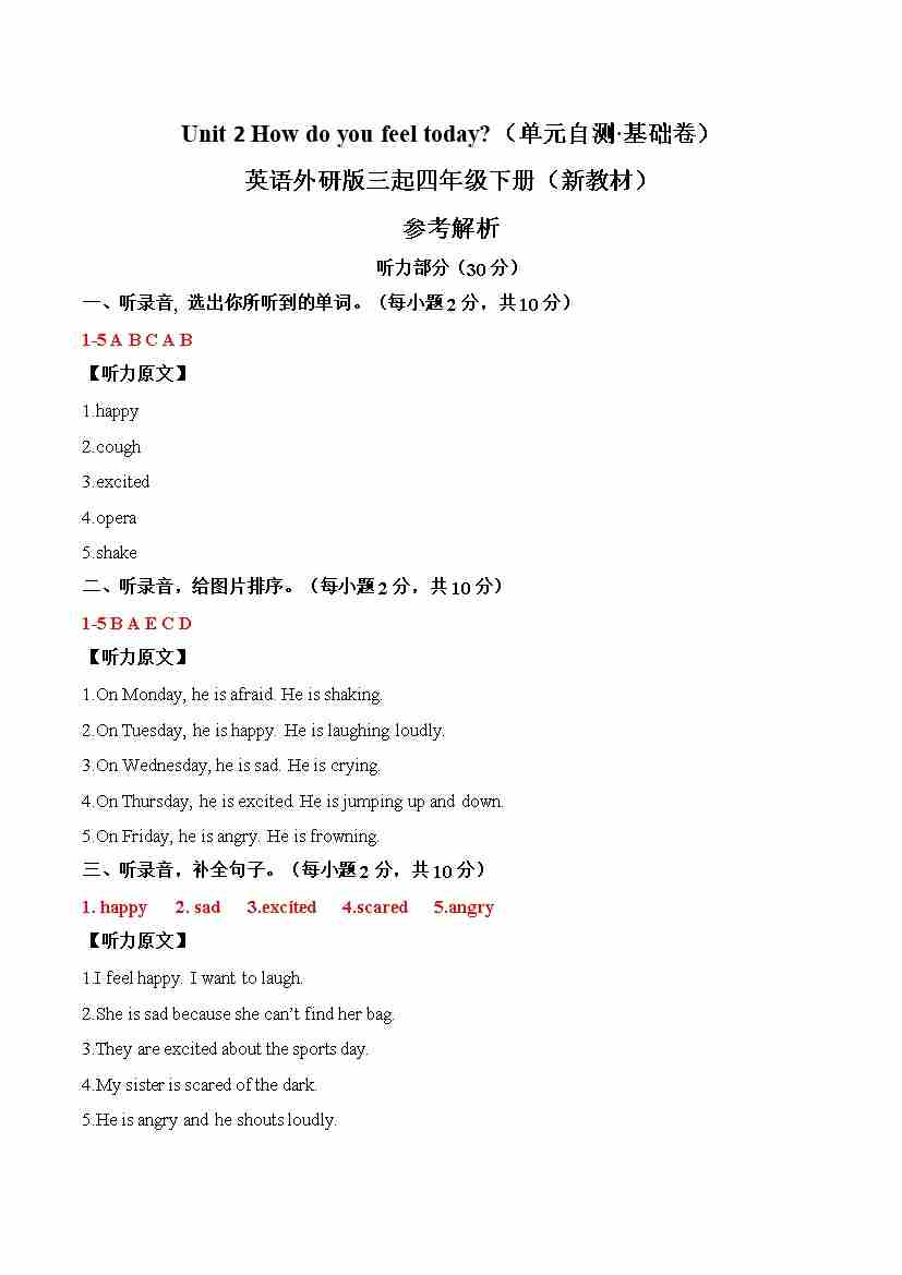 Unit 2 How do you feel today?(单元自测·基础卷)参考解析