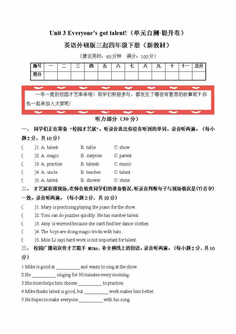 首页 > 全部 > 单元提升卷 > Unit 3 Everyone’s got talent!(单元自测·提升卷)A4版
