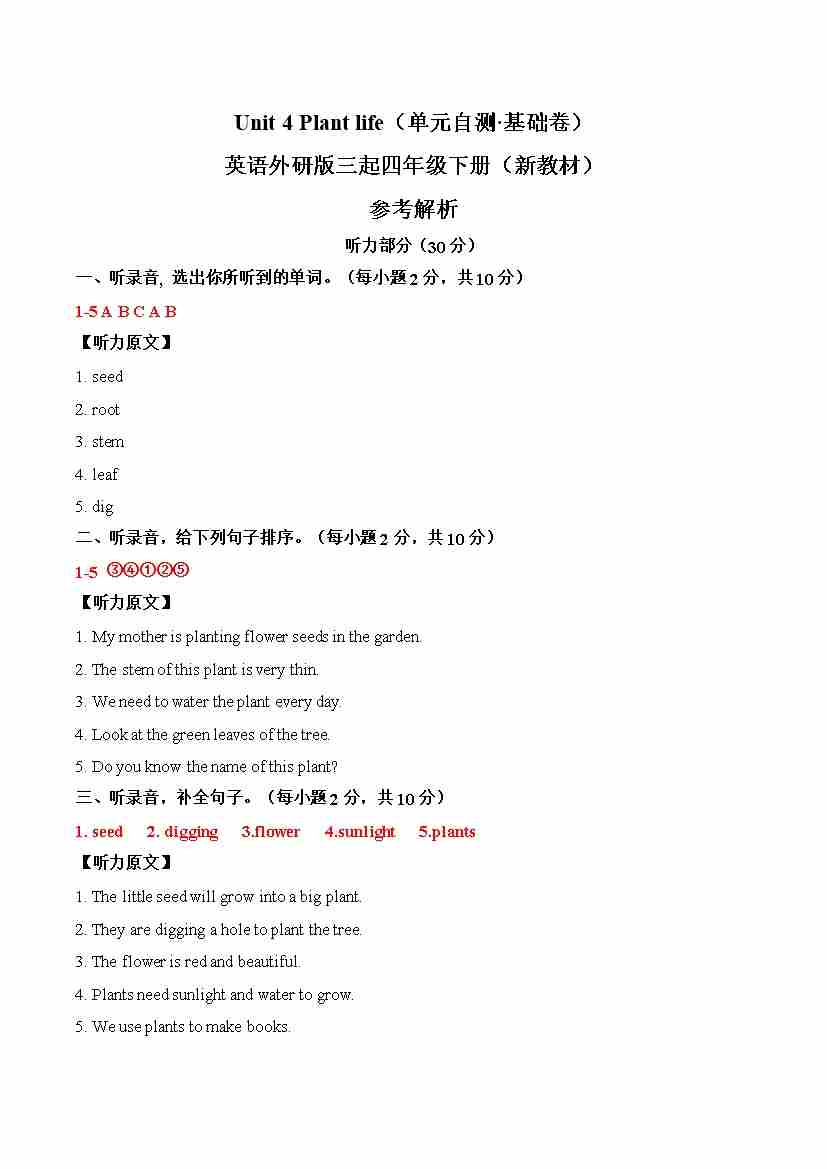 首页 > 全部 > 单元提升卷 > Unit 4 Plant life(单元自测·基础卷)参考解析