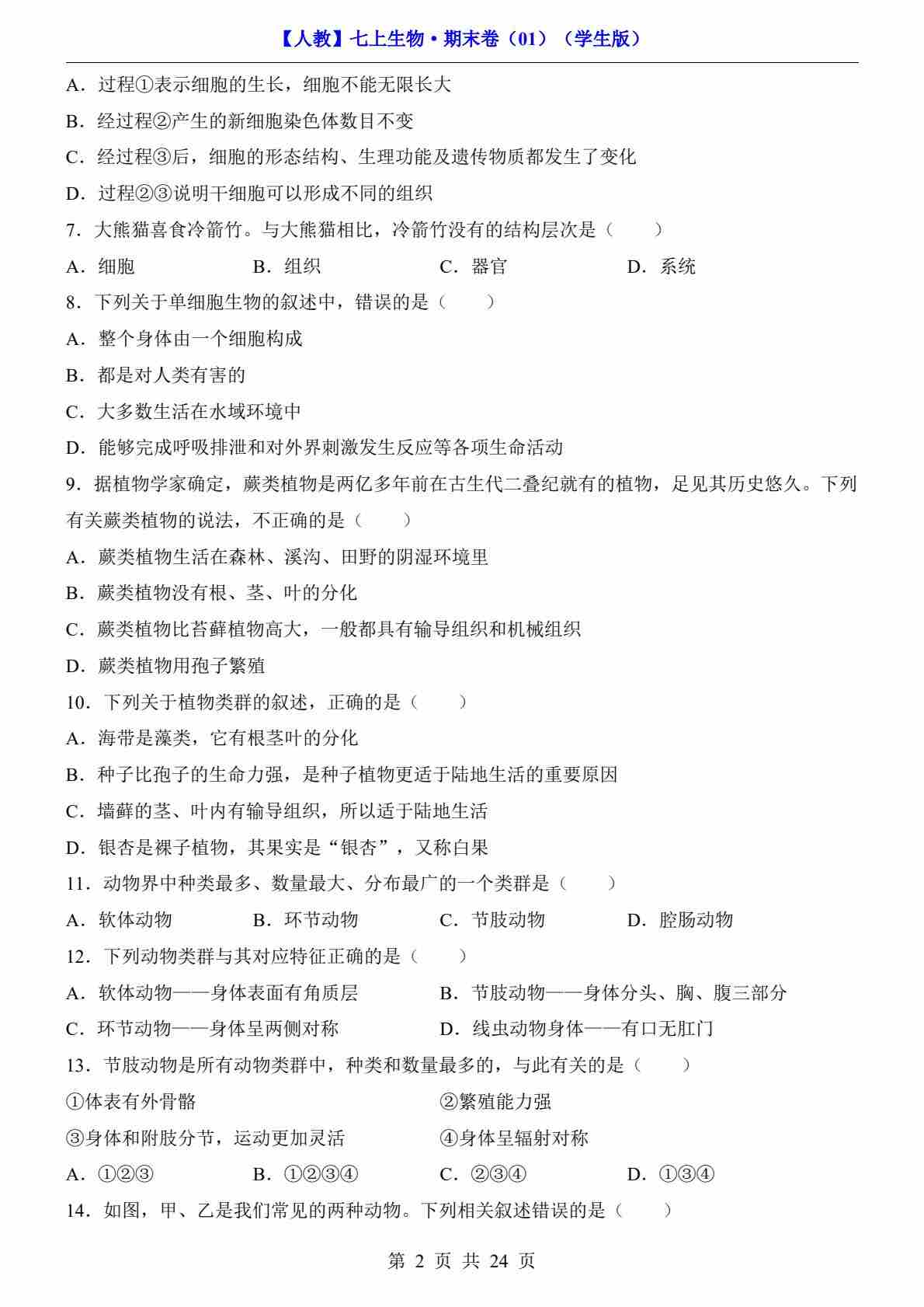 首页 > 全部 > 期末试卷 > 【人教】7上生物期末卷01【七上全册】