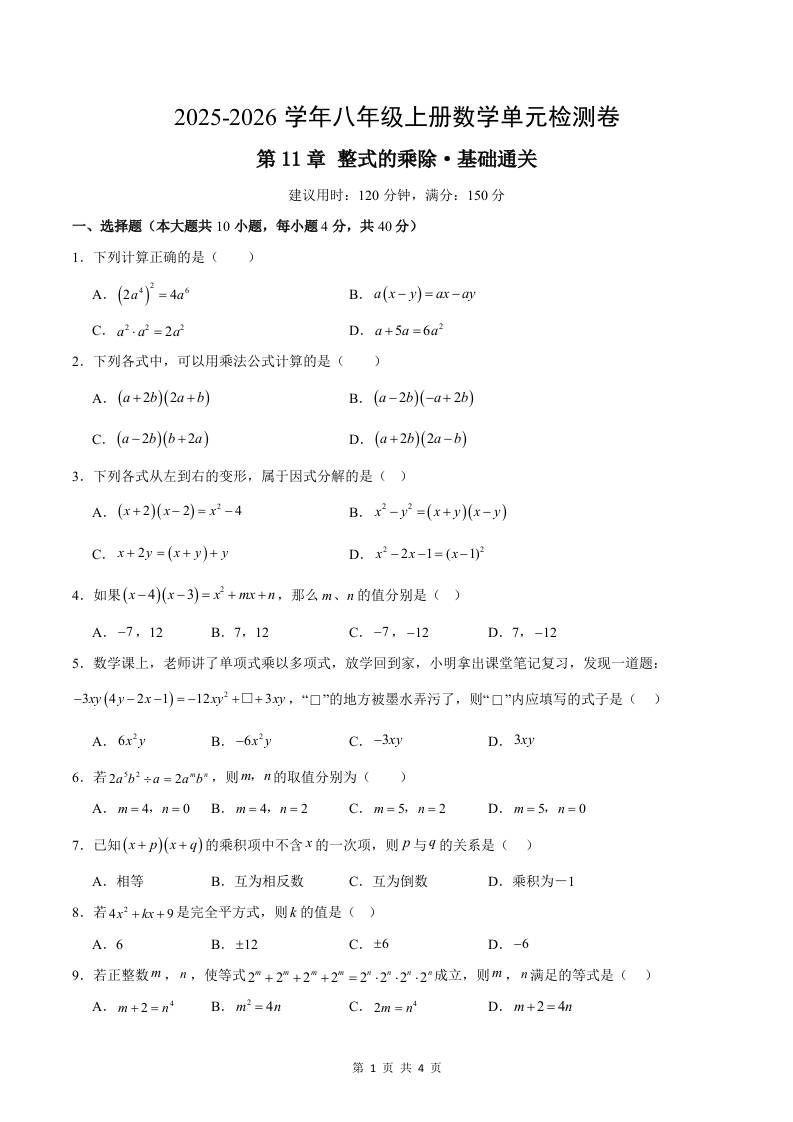 第11章 整式的乘除(单元测试·基础卷)(考试版A4)